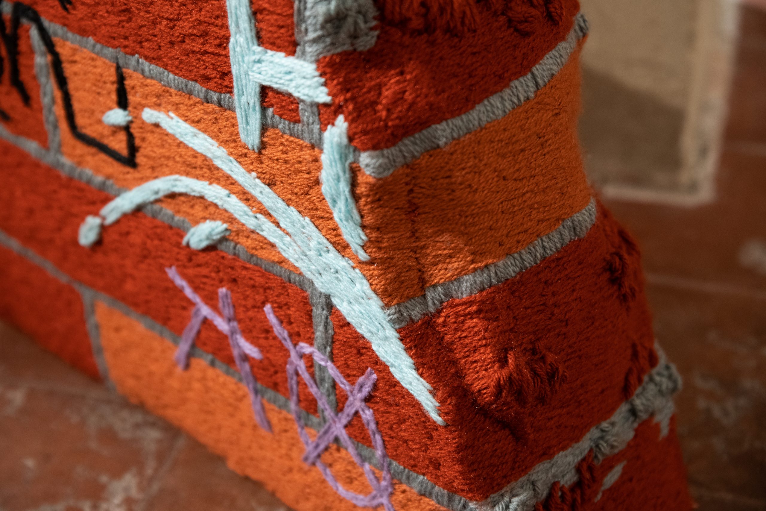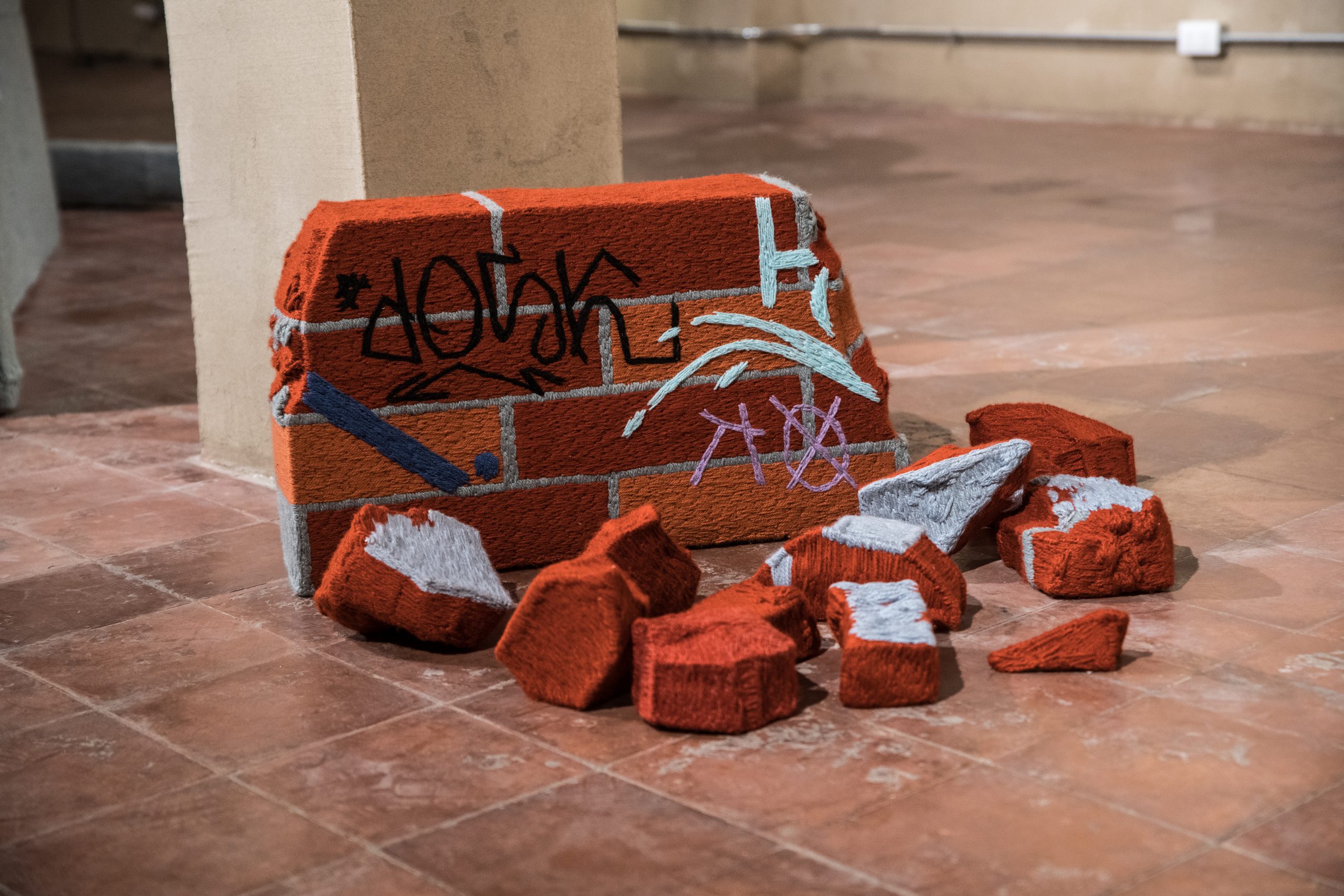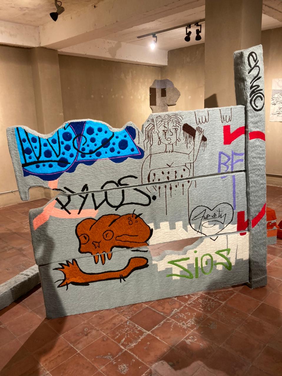 La exposición “No hay cielo sin nubes” de Claudia Gutiérrez en Galería AFA podría ser leída desde la historia del textil, su importancia política y la tradición de artistas nacionales que comparten la técnica del bordado. Pero en su obra ocurre algo que escapa de todo aquello. Y desde ya quiero afirmar que la obra de Gutiérrez habita y se posiciona en el movimiento centrífugo. Esta exposición está conformada por 10 piezas: 8 bordados bidimensionales y 2 tridimensionales. En el trabajo de Gutiérrez podemos ver grafitis y rayados sobre estructuras tipo pandereta, escombros, basurales. Se trata de elementos que exploran situaciones que ocurren en lo que podemos reconocer como la periferia de la ciudad y que contrastan con los vibrantes colores del material de bordado.